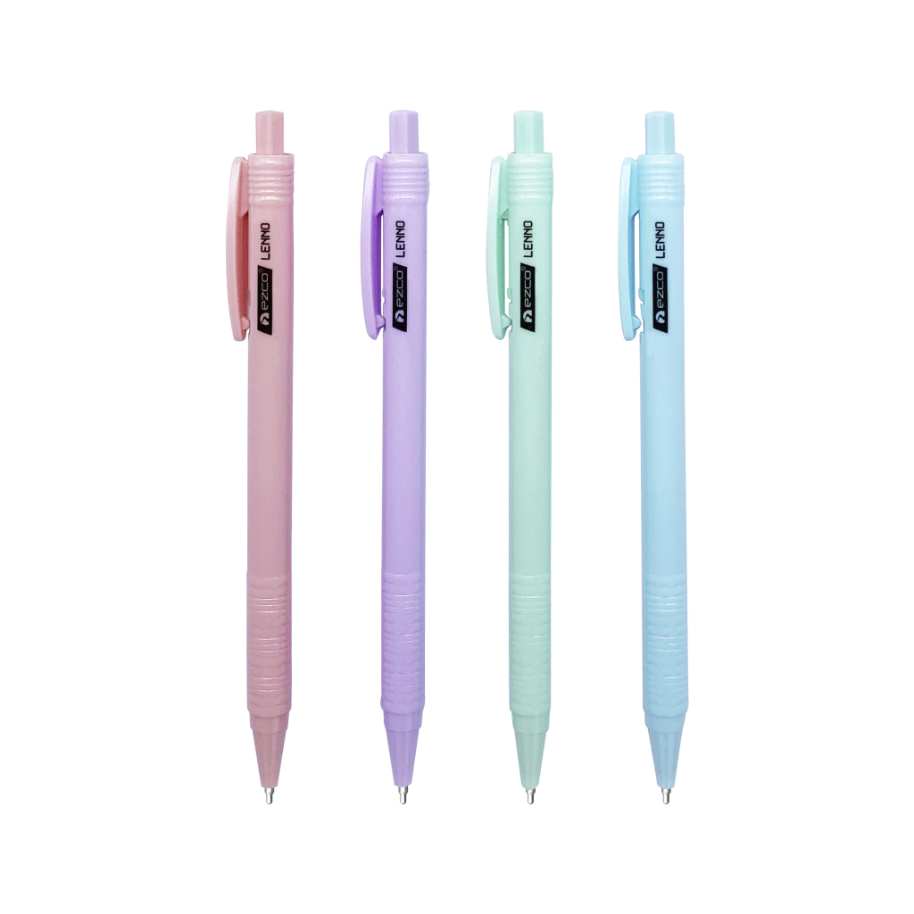 Bolígrafo retráctil Lenno. Punta metálica 1.0 mm de tungsteno, cuerpo pastel (rosa, verde, celeste y lila) y clip plástico, escritura suave.
